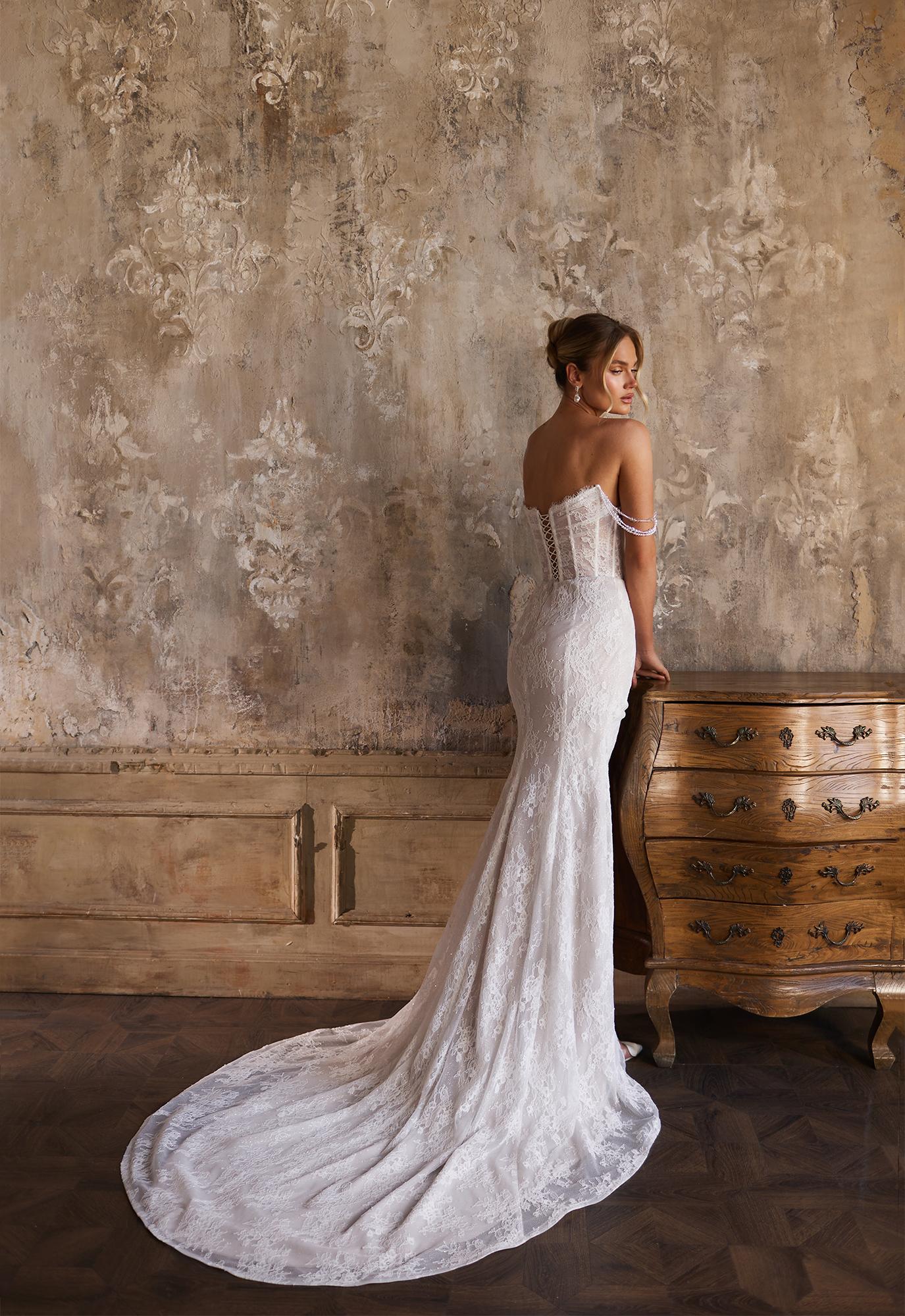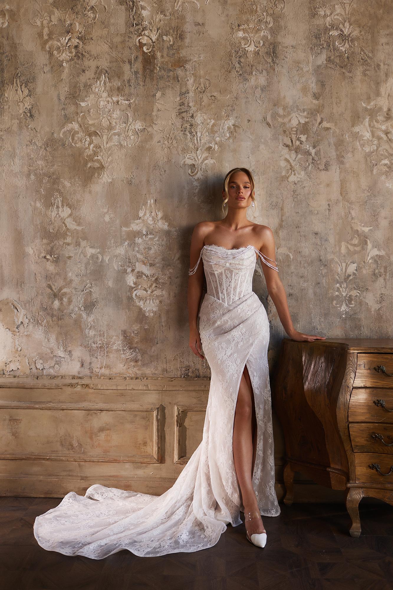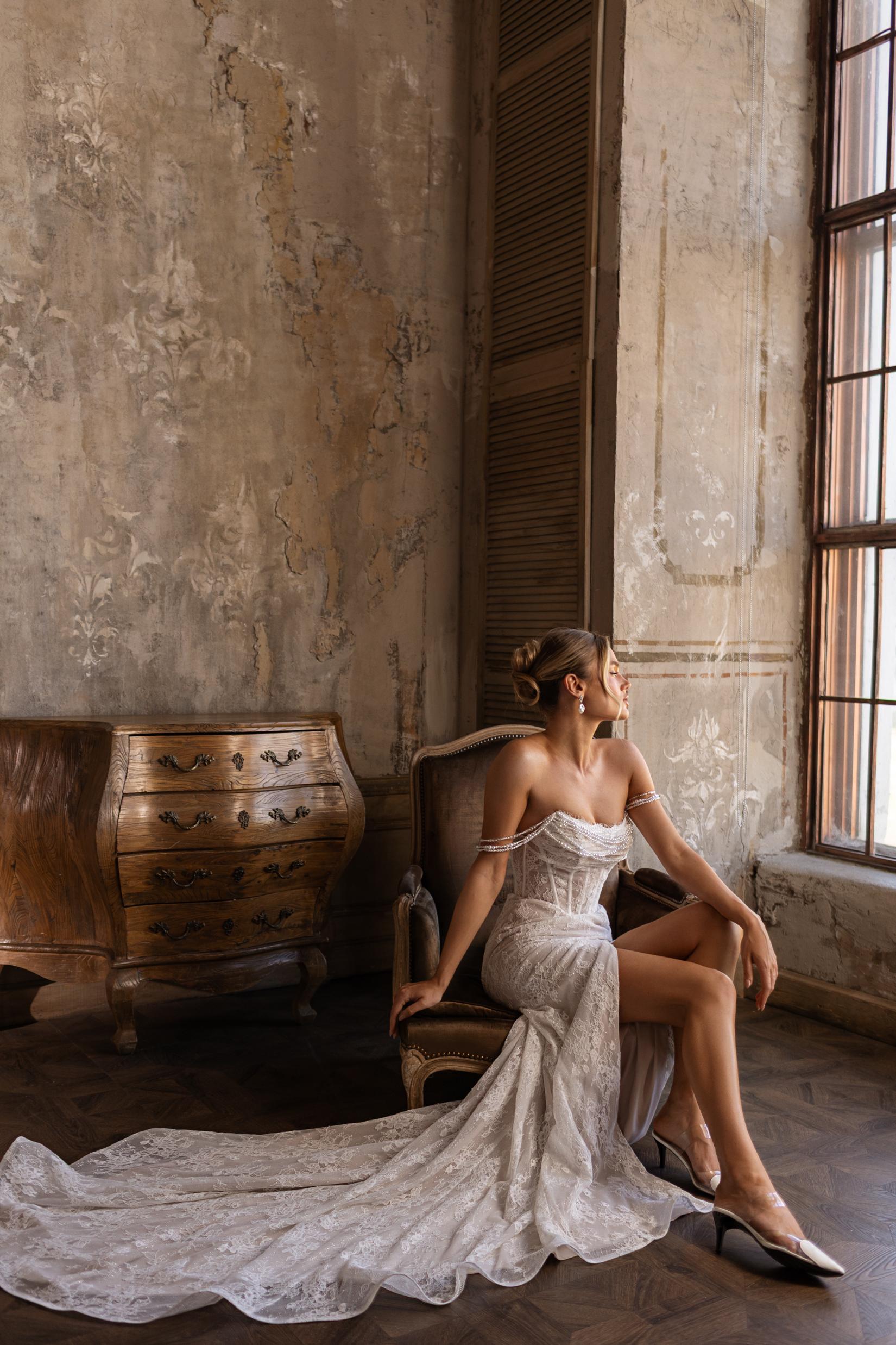Свадебное платье мягко облегает фигуру, оно выполнено из нежного кружева. Спадающие бретели из жемчуга на корсете придают образу воздушность и трепетность. Лиф искусно декорирован жемчугом, создающим тонкое сияние. Элегантный разрез на юбке открывает ножку и добавляет смелости классическому силуэту. Модель дарит ощущение утонченной роскоши и женственности в самый важный день. Размеры: от 40 до 60.