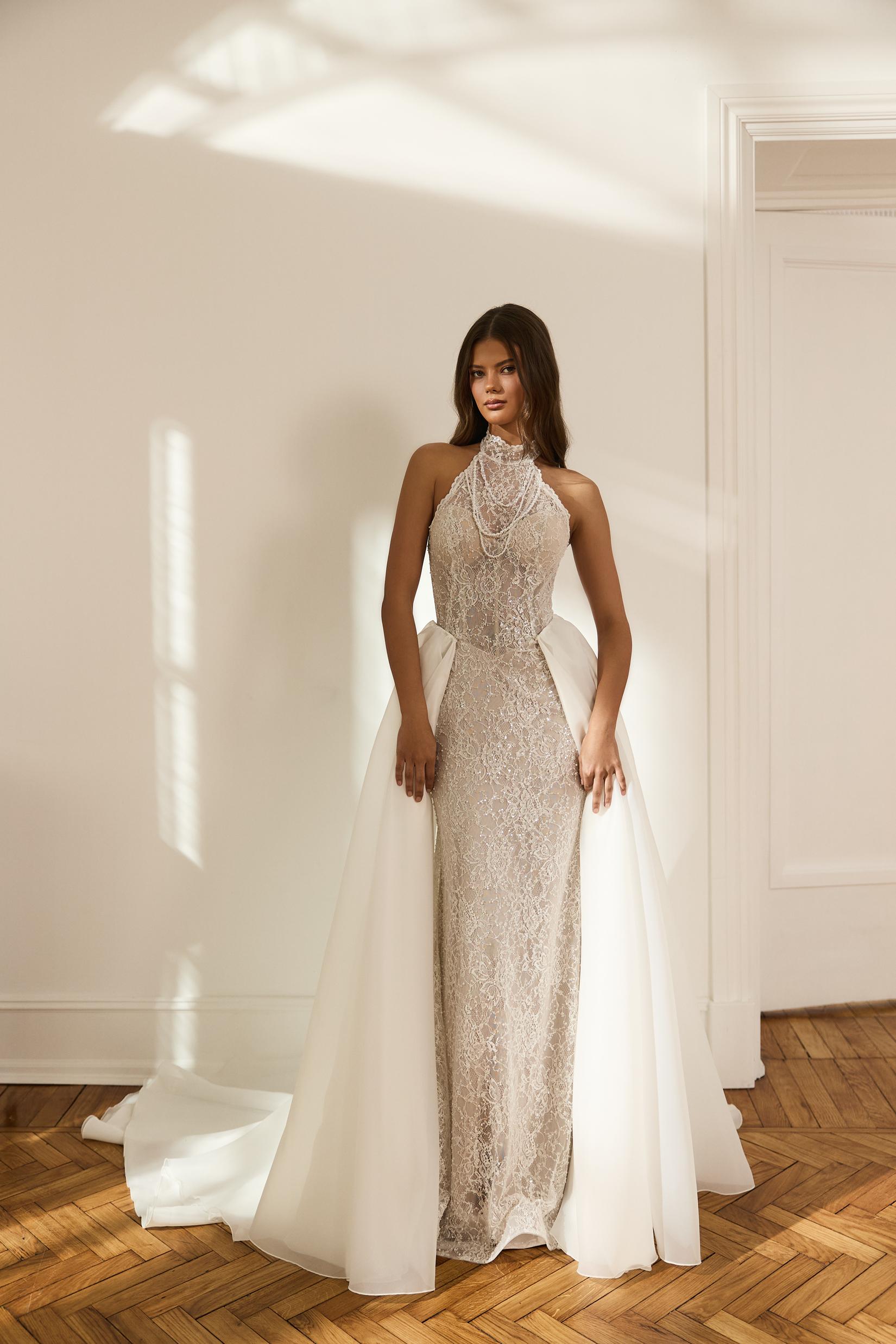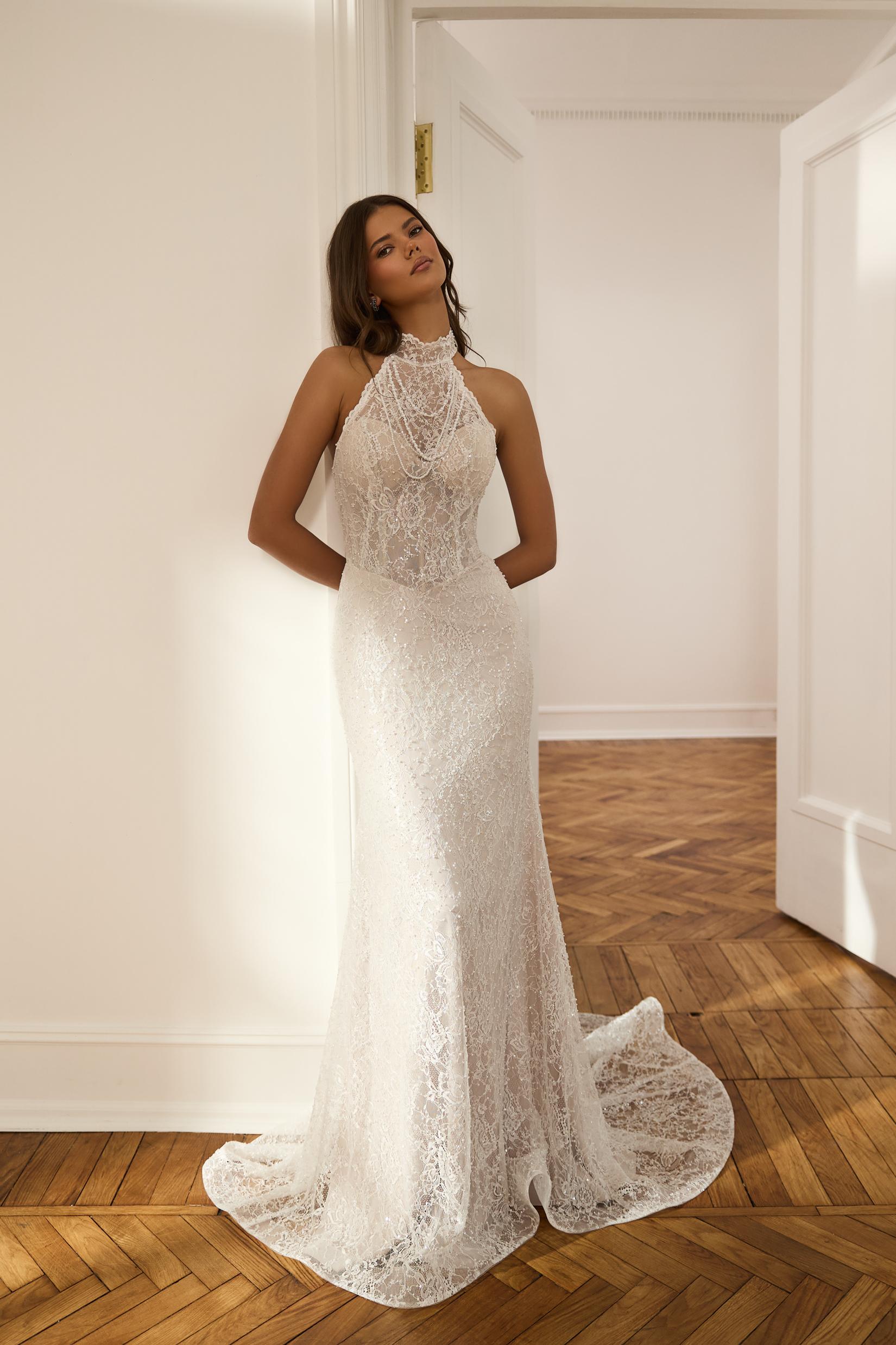 Свадебное платье, мягко ложащееся по фигуре, исполнено из тонкого кружева, полностью расшитого бисером и камнями. Закрытая американская пройма придаёт образу особую изысканность. Горловина платья украшена бусами из жемчуга, словно драгоценным ожерельем. К наряду прилагается съёмный шлейф из струящейся органзы, который привносит нотку торжественности. В нужный момент вы добавите его для величественного выхода или снимете для лёгкости танца.